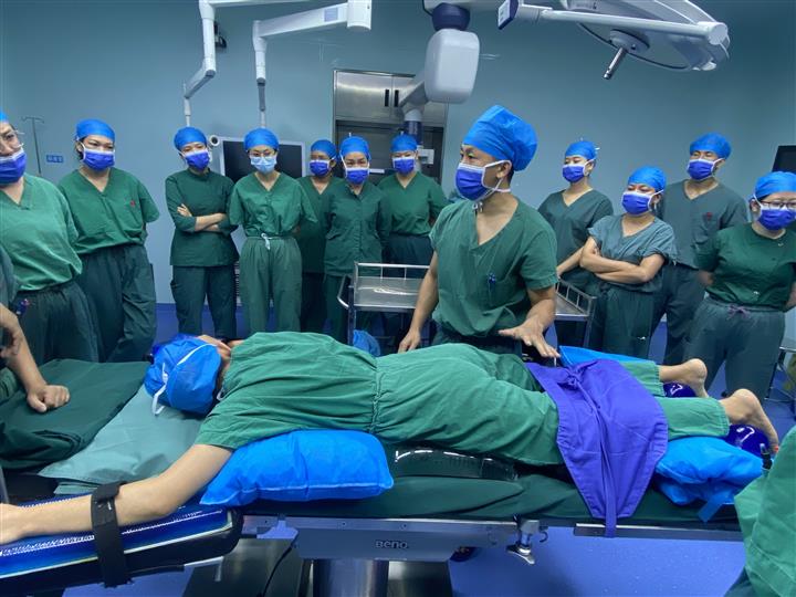 活动分为5个体验环节,分别为转运病人、截石位摆放、俯卧位摆放、侧卧位摆放、水平仰卧位摆放。活动中,扮演者紧密配合,通过真实的体验,换位思考,真正理解患者的感受。